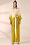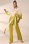 Featuring a citrus yellow asymmetric tie-up shirt in italian crepe base with hand embroidered collar and elasticated cuffs. It is paired with straight pants. Accentuate it with stud earrings and flats for casual outings, brunches, sundowner or family gatherings.