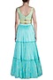 Featuring an aqua blue layered gathered lehenga skirt in modal satin base with floral jaal screen printing. It is paired with a matching blouse having v-neck, waist cut-out belt, beads, cutdana, sequins embroidery and scallop dupatta.