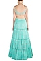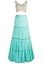 Featuring an aqua blue layered gathered lehenga skirt in modal satin base with floral jaal screen printing, beads, cutdana and sequins embroidery. It is paired with a matching v-neck blouse and scallop dupatta.