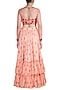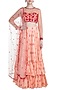 Featuring a peach kalidar lehenga skirt in georgette base with cutdana, beads and sequins embroidery. It is paired with a matching blouse and dupatta in net base having colour embroidery, scallop and chitta work.