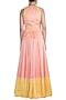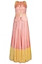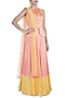 Featuring a peach kalidar lehenga skirt in modal satin base with broad border, floral jaal screen printing, beads, curdana and sequins embroidery. It is paired with a matching sleeveless jacket having front zipper and net dupatta.