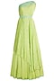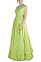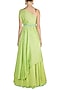 Featuring a pista green kalidar lehenga skirt in modal satin base with gathered panels and belt. It is paired with matching one shoulder draped top having floral jaal screen printing, beads, cutdana and sequins embroidery.