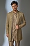 Featuring a beige indowestern in georgette base with sequin embellishments. It is paired with a silk chanderi kurta and cigarette pants. Style this mojaris for a reception, wedding, sangeet or engagement ceremony.