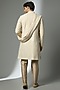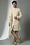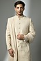 Featuring a beige sherwani in silk base with sequins and thread embellishments. It is paired with a silk chanderi kurta, pants, and an embroidered stole. Style it with mojaris and safa for a wedding or engagement ceremony.