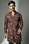 Featuring a burgundy kurta in dola silk base with thread embellishments. It is paired with silk chanderi trousers. Style it with kolhapuri sandals for a festive occasion, family gathering, cultural event or pooja ceremony.
