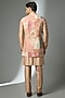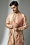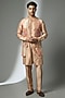 Featuring a champagne beige long jacket in chinon base with mirror embellishments. It is paired with silk chanderi kurta and pants. Style it with mojaris for a festive occasion, cultural event, wedding or engagement ceremony.