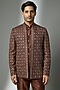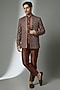 Featuring a chocolate brown indowestern in dola silk base with thread and zari embellishments. It is paired with a silk chanderi kurta and pants. Style it with mojaris for a reception, wedding, engagement or sangeet wear.