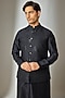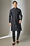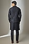 Featuring a dark blue nehru jacket in dola silk base with zari and sequin embellishments. It is paired with a silk chanderi kurta and cigarette pants. Style it with mojaris for a festive occasion, reception, wedding or engagement ceremony.