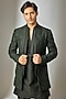 Featuring a dark green indowestern in silk chanderi base with sequins and thread embellishments. It is paired with a kurta and cigarette pants. Style it with mojaris for a reception, sangeet, wedding or engagement ceremony.