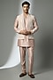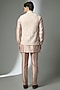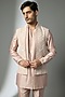 Featuring a dusty pink nehru jacket in silk chanderi base with zari, pearl and thread embellishments. It is paired with a kurta and pants. Style it with mojaris for a reception, sangeet, wedding or engagement wear.