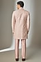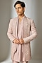 Featuring a dusty pink indowestern in silk chanderi base with pintuck detail, zari, sequins and thread embellishments. It is paired with a kurta and cigarette pants. Style it with mojaris for a reception, wedding or engagement ceremony.