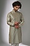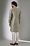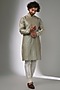 Featuring a greyish green kurta in pure silk base with thread embroidery. It is paired with ivory silk cigarette pants. Perfect wear for a wedding, sangeet or engagement ceremony.