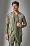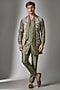Featuring a mehendi green open indowestern jacket in georgette base with thread and sequins embellishment. It is paired with a v-neck kurta and cigarette pants. Style it with loafers for a mehendi, wedding, sangeet or engagement ceremony.