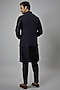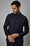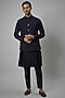 Featuring a navy blue nehru jacket in dola silk base with thread work. It is paired with a matching silk chanderi kurta and cigarette pants. Perfect wear for formal or festive occasions.