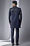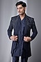 Featuring a navy blue high neck indowestern jacket in silk chanderi base with thread and cutdana embellishments. It is paired with a kurta and cigarette pants. Style it with shoes for a festive occasion, wedding, sangeet or engagement ceremony.