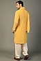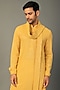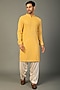 Featuring a pastel yellow kurta in georgette base with sequins embellishments. It is paired with ivory cowl modal satin salwar pants and a silk chanderi stole. Accentuate it with neutral mojaris or classic kolhapuri-style footwear and a sleek watch for a refined finish, ideal for festive gatherings or family functions.