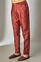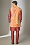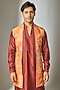 Featuring a rust long jacket in art silk base with abstract print and mirror work. It is paired with a silk chanderi kurta and pants. Style it with mojaris for a festive occasion, reception, wedding or engagement ceremony.