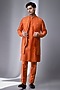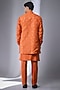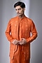Featuring a rust open indowestern jacket in dola silk base with thread and sequins embellishments. It is paired with a silk chanderi kurta and cigarette pants. Style it with shoes for a festive occasion, wedding, sangeet or reception ceremony.