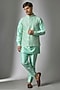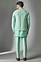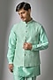 Featuring a turquoise nehru jacket in silk chanderi base with embossed thread and sequins embellishment. It is paired with a kurta and cigarette pants. Style it with loafers for a festive occasion, wedding, sangeet or engagement ceremony.