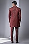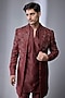 Featuring a wine indowestern jacket in dola silk base with cutdana and french knot embroidery. It is paired with a silk chanderi kurta and cigarette pants. Style it with shoes for a festive occasion, wedding, sangeet or reception ceremony.