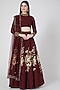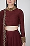 Featuring a burgundy wine lehenga in raw silk base with thread and sequins hand embroidery. It is paired with a matching blouse having full sleeves and a tulle dupatta.