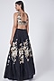 Featuring a midnight blue lehenga in chanderi base with thread, sequins, and floral embroidery. It is paired with a matching embellished blouse and a blush pink dupatta.