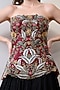 Featuring a maroon strapless corset in chanderi and organza base with floral motif, silk thread and zardosi embroidery. It is paired with a black skirt. Accentuate it with statement jewellery and heels for a festive look or sangeet ceremony.