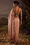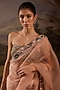 Featuring a blush pink saree in organza silk base with floral embroidery. It is paired with an embellished strapless blouse. Accentuate it with zircon jewellery, heels and a clutch for a sangeet ceremony.