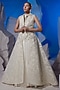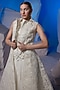 Featuring an ivory dress in cotton silk and chiffon base. It is paired with a cotton jacket. Accentuate it with dangler earrings, a sleek bun, a clutch and pencil heels for a reception or cocktail soirees.