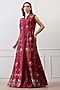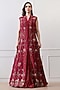 Featuring a maroon jacket in net base with silk thread and zardosi embroidery. It is paired with a skirt. Accentuate it with statement jewellery and wedges for a festive look or sangeet ceremony.