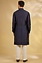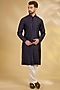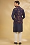 Featuring a blue bundi jacket in silk base. It is paired with a kurta and pants. Accentuate it with tan mojaris and a classic watch for a stylish ensemble, ideal for festive gatherings or any pre-wedding functions.