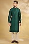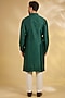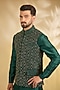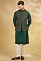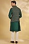 Featuring an emerald green nehru jacket in silk base. It is paired with a kurta and pants. Accentuate it with tan mojaris and a classic watch for a stylish ensemble, ideal for festive gatherings or mehendi functions.