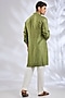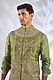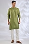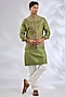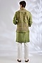 Featuring an olive green and baby pink bundi jacket in silk base. It is paired with a kurta and pants. Style it with mojaris for a wedding, mehendi or engagement ceremony.
