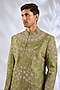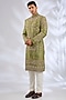 Featuring an olive green sherwani in silk base. It is paired with a kurta and pants. Perfect wear for a wedding, mehendi or engagement ceremony, exuding charm and elegance.
