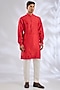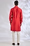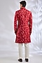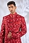 Featuring a red sherwani in silk base. It is paired with a kurta and pants. Perfect wear for a wedding, sangeet or engagement ceremony, exuding charm and elegance.