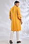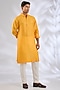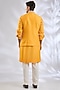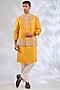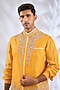 Featuring a yellow bundi jacket in silk base. It is paired with a kurta and pants. Style it with mojaris for a wedding, haldi or engagement ceremony.