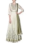 Featuring an off white and sea green anarkali gown in cotton silk base embellished with zari work and silk thread embroidery. It is paired with a matching dupatta.