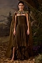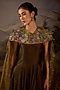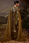 Featuring an olive green ruffled strapless gown in organza silk and cotton silk base. It is paired with an embroidered cape. Accentuate it with stud earrings, heels and a clutch for a mehendi or an engagement ceremony.