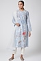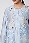Featuring a sky blue kurta in cotton silk base with zardosi embroidery. It is paired with contrasting white palazzo pants and an organza dupatta.
