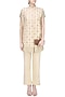 This set features a cream kaftan style jacket in cotton silk base embroidered with gota and kasab embroidery all over. It is paired with cream cotton silk pants.
