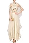 This set features a cream cutout blouse in cotton silk base with doru, resham and kasabh floral embroidery all over. It is paired with cream organza cape with floral embroidered border and cream flared georgette skirt.