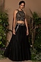 Featuring a black blouse in habutai silk base with metal embroidery. It is paired with a matching rayon lehenga.