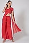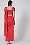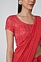 Featuring a coral pre-draped saree in viscose georgette base. It is paired with a hand embroidered stitched blouse. Accentuate it with statement jewellery and heels for a wedding, engagement or sangeet ceremony.
