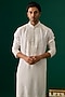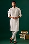 Featuring an off-white kurta in tussar base with resham, threadwork, hand and machine embroidery. It is paired with spun cotton pants. Perfect wear for a festive occasion, wedding or engagement ceremony, exuding charm and elegance.