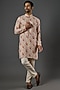 Featuring a beige kurta in linen base with print and katha work. It is paired with contrasting churidar pants.