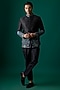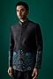Featuring a black bandhgala in silk base. It is paired with pants. Style it with patent leather shoes for a cocktail, wedding or engagement ceremony.