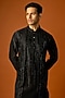 Featuring a black kurta in silk base with embroidery. It is paired with pants. Accentuate it with kolhapuris or embroidered juttis for an elegant yet easy going look, perfect for pooja ceremonies, festive gatherings or sangeet celebrations.