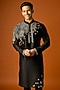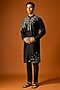 Featuring a black kurta in silk base with embroidery. It is paired with pants. Accentuate it with kolhapuris or embroidered juttis for an elegant yet easy going look, perfect for pooja ceremonies, festive gatherings or sangeet celebrations.
