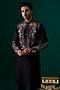 Featuring a black kurta in tussar base with resham, threadwork hand and machine embroidery. It is paired with spun cotton pants. Perfect attire for a festive occasion, sangeet or engagement ceremony, exuding traditional charm and timeless elegance.