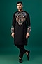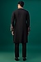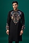 Featuring a black kurta in tussar base with threadwork, resham hand and machine embroidery. It is paired with spun cotton pants. Perfect for a festive occasion, wedding or engagement ceremony, exuding traditional charm and elegance.